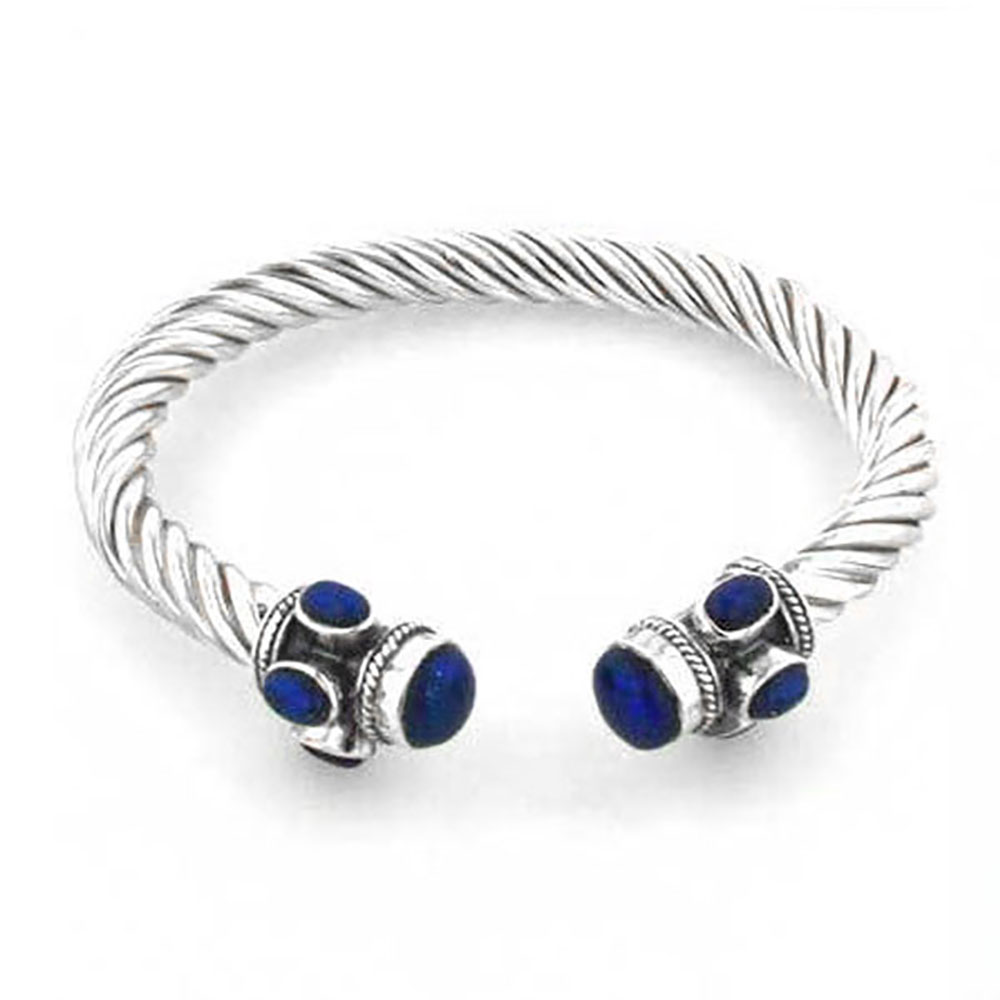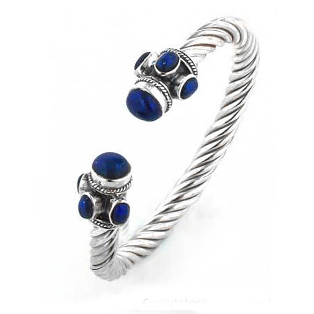 From our Twist Collection: Lapis lazuli and sterling silver cable bangle. This is a sturdy cuff is flexible to ease fitting it onto the wrist.  The ends are decorated with Lapis Lazuli cabochons.
