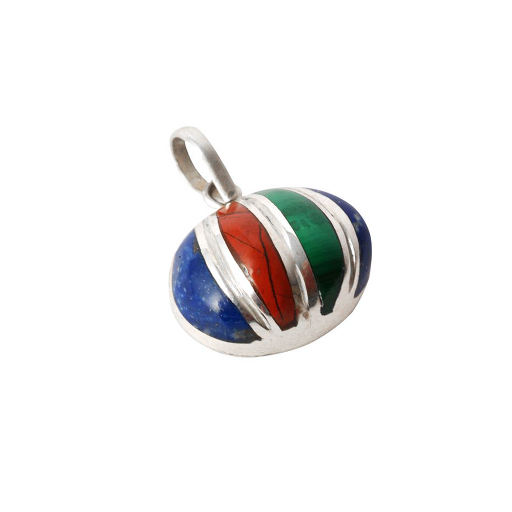 An incredible jewellery creation! This striking pendant is handcrafted in 950 Sterling Silver with expertly cut Lapis lazuli, Malachite and Jasper stone slices set on silver. A generous bail completes the design.
