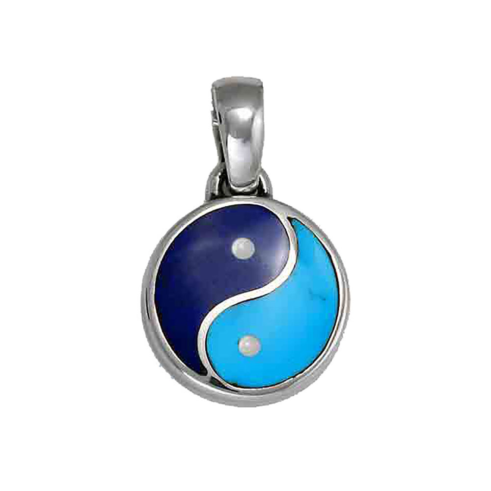 Crafted in solid 950 Sterling Silver with inlaid Lapis Lazuli and Turquoise. It measures 0.60″ in diameter.