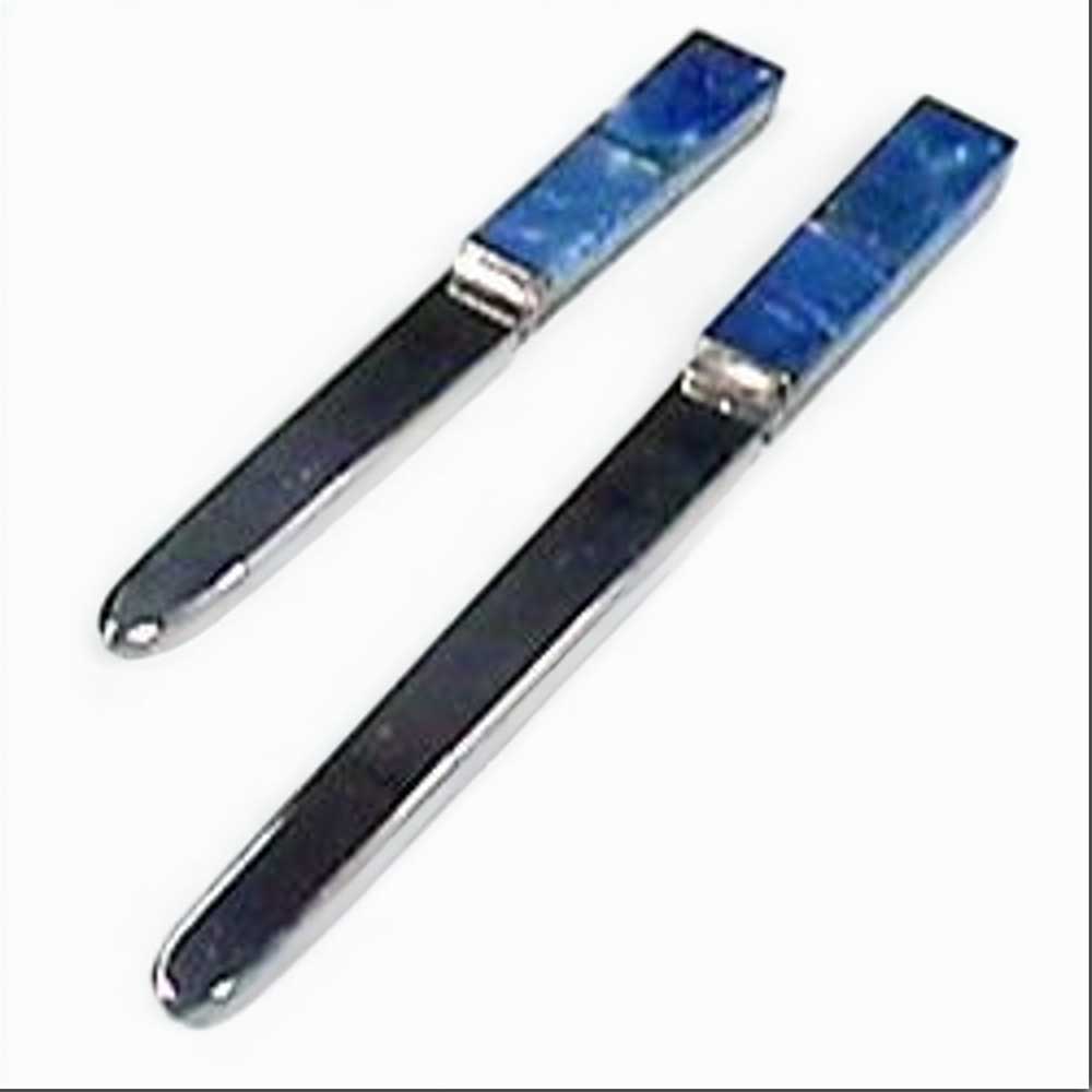 These letter openers are silver plated, with a solid Lapis Lazuli handle. the long letter opener measures 15 cms (6″) long; the sort letter opener measures 10 cms (4″) long. They comes in a handsome blue silk box, ready for gift giving. The long letter opener can be monogrammed or engraved. Please add $3.00 for this service.